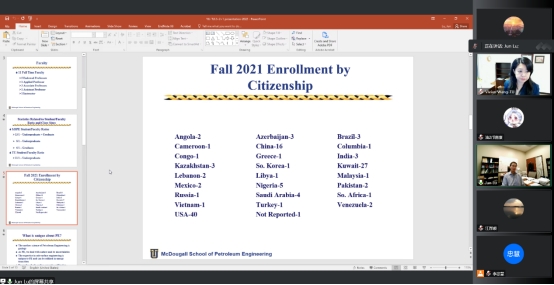(通讯员 成雨音 周晓峰)11月8日晚9时,韦德官方网站与美国Tulsa大学“2+2+1”联合培养项目线上宣讲会顺利举行,Tulsa大学全球事务副董事长Vivian Wang、Jun Lu博士,公司国际交流与合作处处长曾亚军,bevictor伟德官网经理江厚顺、副经理李忠慧、张菲菲、公司党委副书记刘娥参加活动,李忠慧副经理主持。石油工程专业2021级和2022级员工共计270余人报名参加了本次宣讲会。