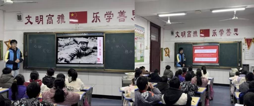 当讲述到铁人王进喜的事迹时,气氛达到了高潮。宣讲志愿者绘声绘色地描述着王进喜带领工人在艰苦条件下战天斗地的场景,从玉门油矿的初露锋芒,到大庆石油会战的艰苦卓绝,王进喜“宁可少活二十年,拼命也要拿下大油田”的钢铁誓言,以及他带领工人用身体搅拌泥浆的震撼场景,震撼着每一位同学的幼小的心灵。同学们沉浸其中,仿佛置身于那个激情燃烧的岁月,真切感受到了石油先辈们为了国家能源事业无私奉献、顽强拼搏的壮志豪情。同学们聚精会神地听着,被铁人顽强意志深深震撼。他们纷纷表示,从没想过石油开采如此艰辛,铁人叔叔们太了不起了。