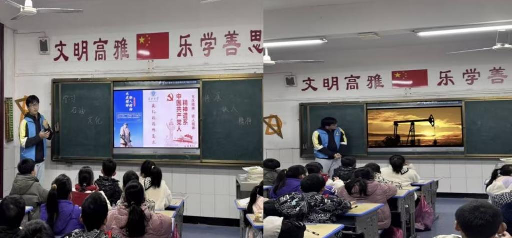 “同学们,大家看看我们周围,汽车需要汽油才能行驶,冬天取暖要用天然气,我们生活中的很多方面都离不开油气产品。但你们知道这些油气是怎么来的吗?”随着这样的提问,这场别开生面的以铁人精神为核心的宣讲活动拉开了帷幕,为孩子们开启了一段探寻石油精神的奇妙旅程,宣讲志愿者通过生动的图片视频和简洁易懂的文字,向同学们展示了石油的形成过程、分布情况等相关知识,孩子们的眼中满是好奇与惊叹。“原来石油的形成要经过这么漫长的时间和复杂的变化,真是太神奇了!”一位同学不禁感叹道。