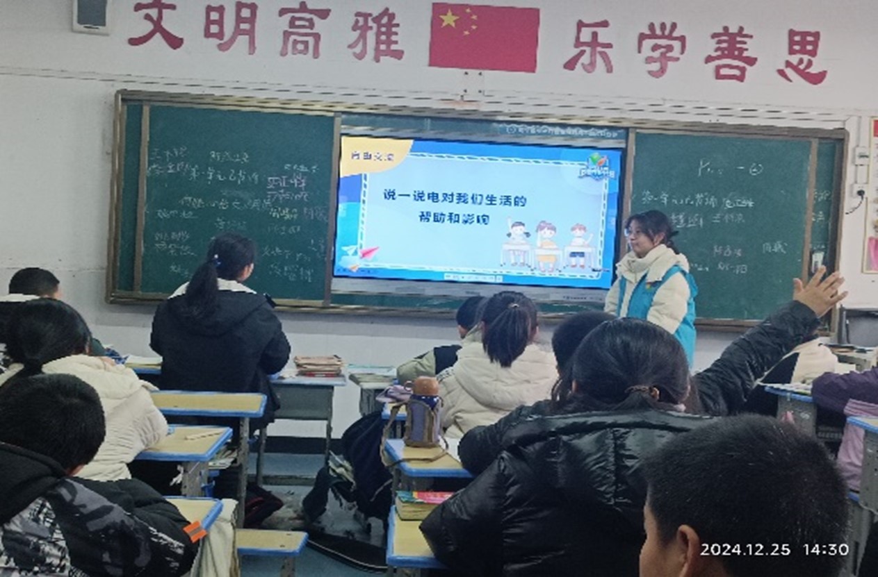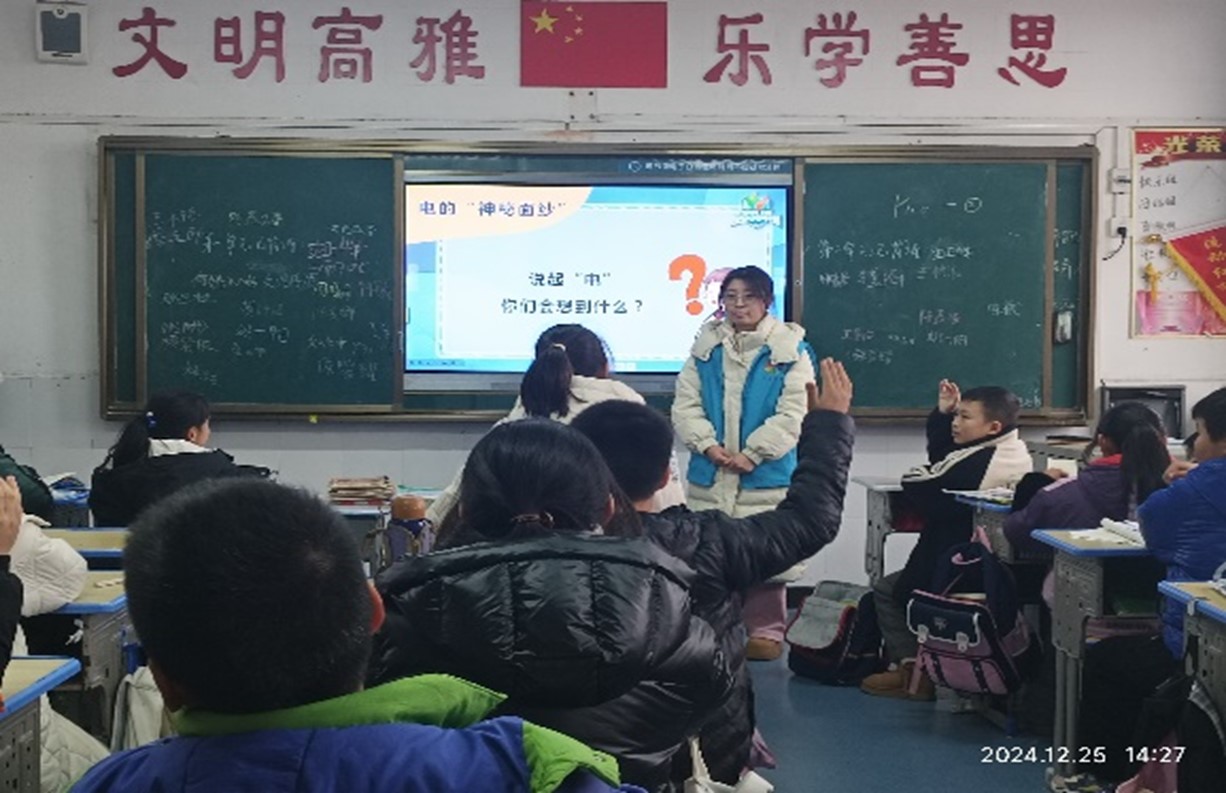 首先,志愿者抛出问题,让同学们思考“电”让人想到什么,来引出主题——用电安全。同学们踊跃举手发言,积极配合,方便了志愿者进行深入介绍。在自由交流环节,志愿者和同学们讨论电对我们生活的帮助和影响。通过交流,能够知道同学们对电的认识,加强对电的了解。为了避免用电事故的发生,志愿者向同学们科普了安全用电的小知识以及一些用电隐患,同时强调了电的可怕性,提高同学们对用电的警觉性。