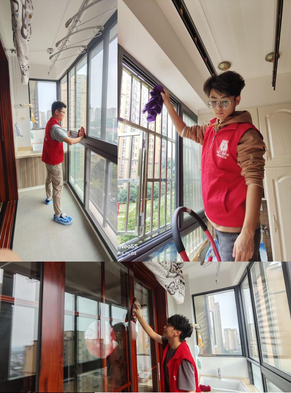 活动当天,志愿者们怀揣热情与责任,分组走入社区老人的家中。手握抹布、拖把、清洁剂,他们细致入微地清理房间,认真擦拭每一扇玻璃窗,让尘埃散去,阳光洒满屋内。窗明几净间,老人们眼中闪烁着喜悦与感动,他们不吝赞美之词,连连夸赞志愿者们的用心与贴心。