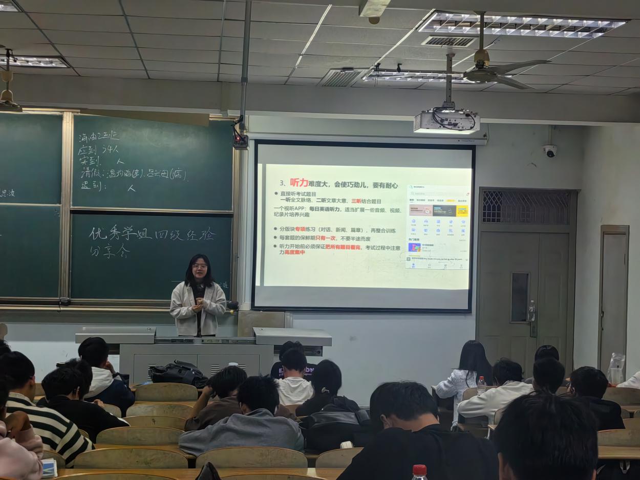 (通讯员 谭钧尹)为了让同学们更好的掌握学习英语的方法并有效的备战英语四级考试,公司24级新生于11月5日举办“优秀学姐四级经验分享会”,本次英语四级经验分享会邀请到班主任方含之老师,熊雪景、张美晨两位学姐,海油1、2班全体同学参与。 活动伊始,熊雪景学姐走上讲台,她强调四级和绩点的重要性。四级考试不仅是对老员工英语综合能力的一种检测,而且也是现在老员工高质量就业的基本条件。绩点同样至关重要。绩点是对员工学业成绩的量化体现。在大学的评优评先中,绩点往往是首要的衡量标准。高绩点的员工更容易获得奖学金、荣誉称号。在学习方面,熊雪景学姐强调了时间管理的重要性。她指出,大学的学习生活丰富多彩,但也充满挑战,合理安排时间是取得优异成绩的关键。 接着,张美晨学姐为我们带来了丰富的四级经验。首先,她向我们强调了词汇是英语学习的基本,可以使用四级词汇书或者手机APP,要坚持、充分利用碎片化的时间,及时巩固、刻意联想。接着,她向我们介绍了阅读的方法:循序渐进、熟能生巧。学姐强调,带着问题读文章是非常高效的做题方法,而挑选合适的难度和感兴趣的文章更容易坚持下去。最后学姐向大家介绍了大家最头疼的听力部分的做题方法,她提到“听力难度大,要会使巧儿,有耐心”,她建议直接听考试听力并至少听三遍:一听全文脉络、二听文章大意、三听结合题目,她强调在听力开始前必须保证把所有的题目看完,考试过程中注意力高度集中。 通过两位学姐的经验分享,大一的同学们收益颇深,对大学的英语学习有了更清晰的认识和规划,相信同学们在今后的学习中,能够结合自己的实际情况,制定出适合自己的学习和发展计划,在大学这个充满机遇和挑战的舞台上绽放出属于自己的光彩。 【审核:周雨薇】