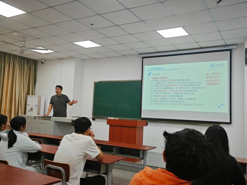 (通讯员 窦晨轩/文 成雨音/摄)为提升员工工作者撰写新闻稿件的能力,加强同学们对于宣传活动的重视程度。10月10日中午12点,辅导员韩清越在武汉校区A栋101教室举办了宣传培训会。员工会各部门成员及各班团支书均参加了本次活动。