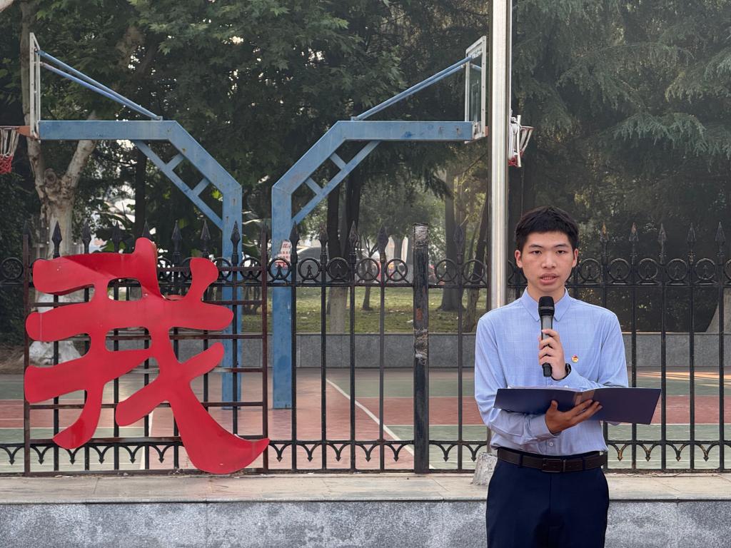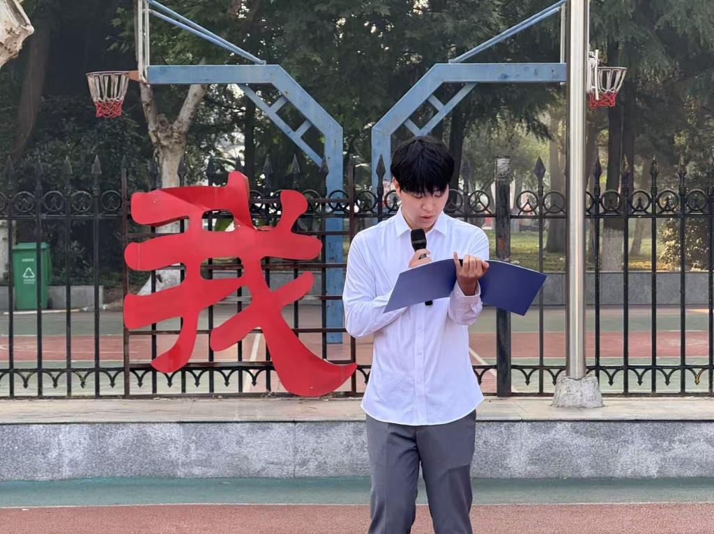 升旗仪式后,油工12402班粟思睿同学作为员工代表发言,分享了四六级备考的实用经验,并从时间管理、互助学习等方面发出倡议,号召同学们以积极态度投入复习,共同营造勤学笃行的优良学风。