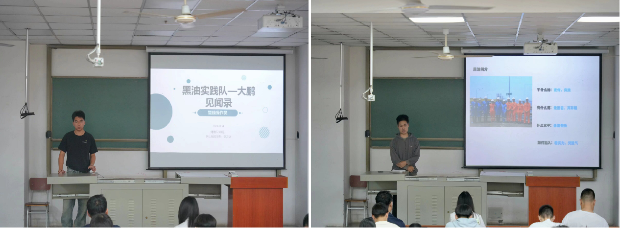 活动伊始,实践队队员魏永辉首先介绍了“黑油”实践队的发展历程,并详细分享了他在西部钻探公司35天的实践经历。实践之初,由于缺乏实操经验,魏永辉和其他实践队员需要从基层小工做起。面对困难,他们展现了长大学子坚韧的精神,最终赢得了井队的认可,并接受了技术员培训。魏永辉认为,这段经历不仅磨练了他的性格和工作能力,还对他就业起到了很大的帮助。同时,他寄语学弟学妹们要珍惜时光,认真学习提高绩点,积极参与实践活动。