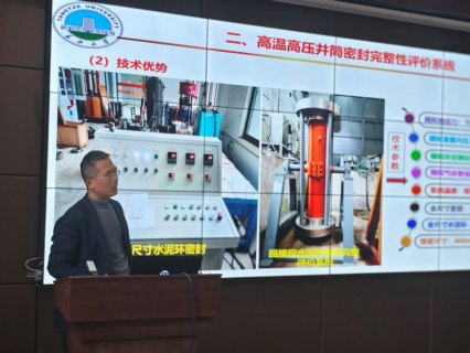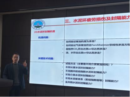 杨焕强副教授深入探讨了高温高压下井筒密封完整性的评价体系,由此展现出了深厚的科研热情,严谨的科研理念,以及系统的科研方法,吸引了在场师生的热烈讨论。在技术背景的讲解过程中,杨焕强副教授提出了老井转CO2注入井的井筒安全状态不明确的问题,明确老井转注安全运行界限对保障老井转CO2注入井的井筒完整性具有重要意义。在研究现状中,杨焕强教授详细剖析了现有的水泥环密封完整性评价装置有以下局限性,地层影响考虑少、实验装置温度压力达不到实际温压变化需要、模拟装置尺寸小、压力体系不完整、井筒结构不完整。