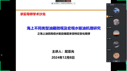 2024年12月8日下午15:00,由屈亚光副教授主讲的求实导师学术沙龙系列活动“海上油田不同类型油藏微观及宏观水驱油机理研究”专题讲座在石油科技大楼C420及线上同步举行。本次讲座吸引了油气田开发专业的研究生参加,现场员工认真倾听屈亚光老师的讲解,并对相关问题进行了讨论。