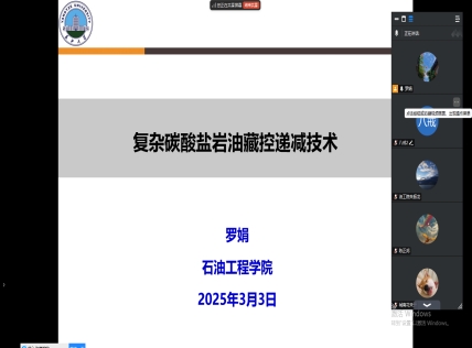 2025年3月3日周一晚20:00,由罗娟副教授主讲的“复杂碳酸盐岩油藏控递减技术”主题学术沙龙通过腾讯会议举行,本次活动面向其所在科研团队的研究生。