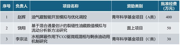 赵辉教授申报的“油气藏智能开发模拟与优化调控”项目获青年科学基金项目(A类)(原国家杰出青年科学基金项目)资助400万元,其研发的智能油藏开发技术已深度应用于中海油OSIM软件及雪佛龙、壳牌等国际企业系统,助力国产化技术替代,标志着公司在高层次人才培养与核心技术攻关中取得历史性突破。饶翔副教授的面上项目、李宗法讲师的青年科学基金项目(C类)同步获批,三类不同层次项目落地,既契合国家战略需求,也展现了团队从领军人才到青年骨干的完善梯队。