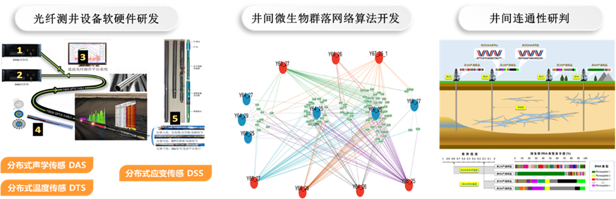 研发了不同距离、精度、分辨率要求的DTS分布式测温系统,形成了不同特征的光纤测井技术,实现直井/水平井监测、实时找水堵水、实时稳产增产等功能。基于注采井共有微生物群落统计信息,开发了不同注采井间微生物群落传递活跃程度分析算法,构建了微生物群落网络图,实现注采井间连通程度研判。